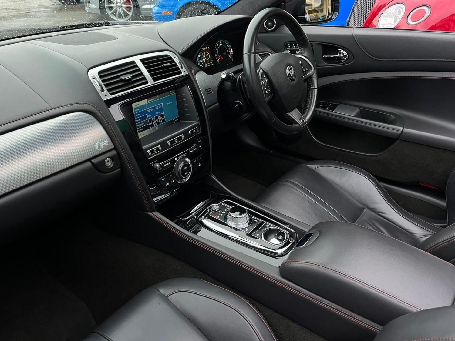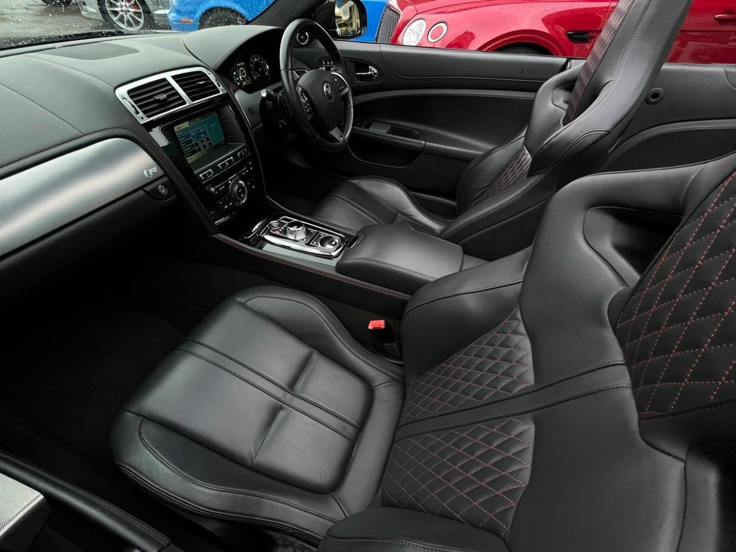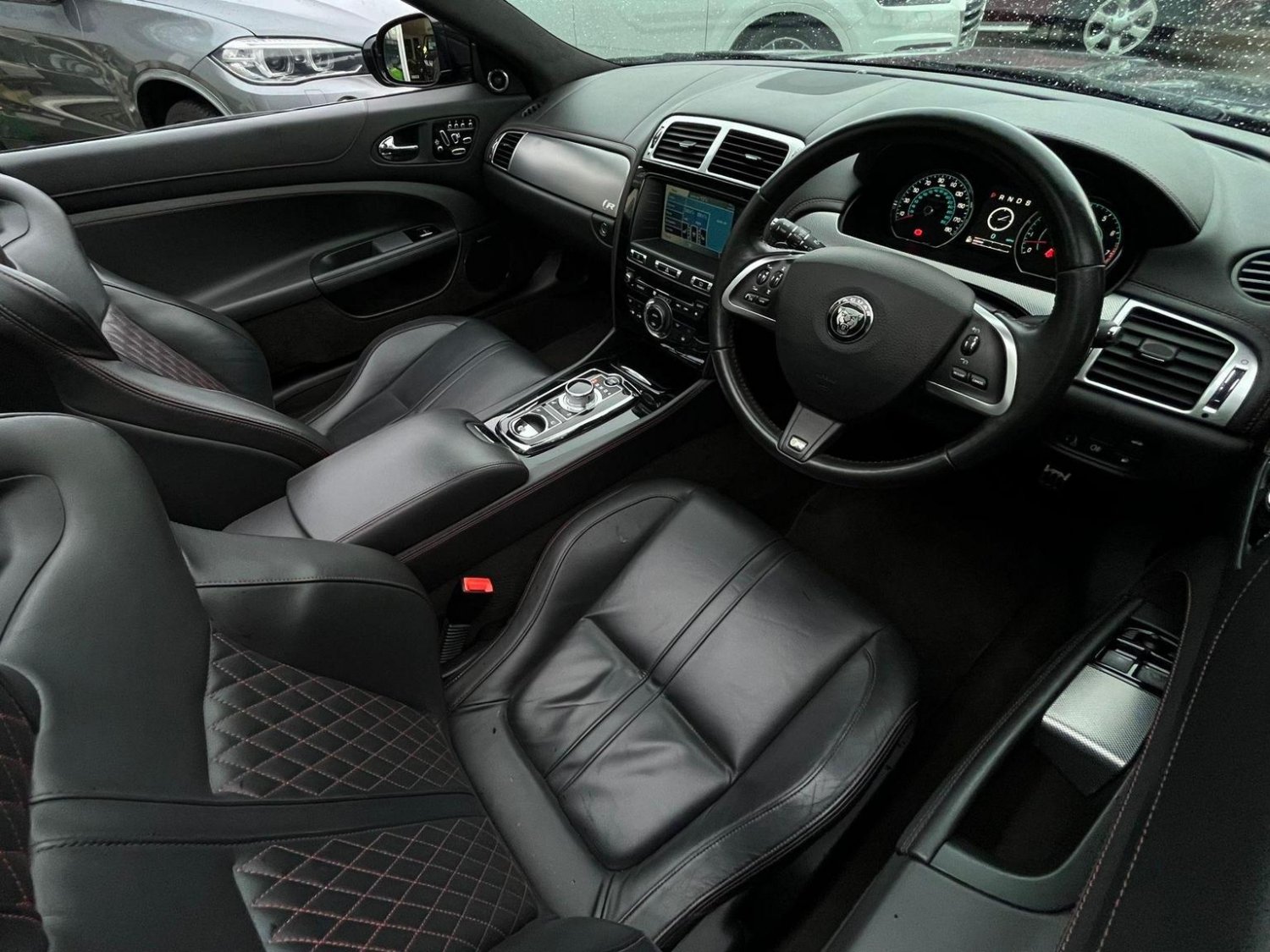 20in Alloy Wheels - Vortex, 7in Colour Touch Screen Display, ABS - Anti-locking Braking System, Accessory Powerpoint in Glovebox, Active Differential Control, Adaptive Dynamics, Adaptive Restraint Technology System, Air Particle and Odour Filtration, Airbags - Driver, Airbags - Front Side, Airbags - Passenger, Ashtray and Lighter, Audio Connectivity Module - USB, Automatic Headlight Washers, Auxiliary Power Sockets, Bluetooth Telephone Connectivity, Bowers and Wilkins 525W Surround Sound System, Bright Stainless Steel Pedals, Convertible Roof - Full Electric Black, Cruise Control, DAB Radio Receiver, Dark Mesh Aluminium, Daytime Running Lights - LED, Dual Zone Automatic Climate Control, EBA - Emergency Brake Assist, EBD - Electronic Brake-Force Distribution, EPB - Electronic Parking Brake - Drive Away Release, Electric Windows, Exterior Mirrors - Power Foldback-Electrochromic-Heated-Memory with Integrated LED Lights, Front Bumper - Black Outboard Bezel and Black Mesh Inserts, Front Parking Aid, Headlights - Automatic Levelling, Headlights - Bi-Function HID Xenon with LED Daytime Running Lights, Heated Front Seats, Heated Front Windscreen, Heated Steering Wheel, Humidity Control, ISOFIX Rear, Interior Rear View Mirror - Electrochromic, Jaguar High Performance Braking System, Jaguar Sequential Shift - Steering Wheel One Touch Paddles, Jaguar Smart Key System with Keyless Entry, Jaguar Smart Key System with Keyless Start, Jaguar Tyre Repair System, JaguarDrive Control with Winter Mode and Dynamic Mode, LED Tail Lights, Louvered Bonnet with Supercharged Script, Navigation with Route Guidence with Traffic Messaging Channel, Open Differential, Pedestrian Contact Sensing and Deployable Bonnet, Performance Active Exhaust - Quad Tailpipes, Perimeter Sensing and Sounder, Phosphor Blue Halo Illumintion including Mood Lighting, Power Assisted Steering, Premium Carpet Mats - Nubuck Edged with Jaguar Script, Premium Headlining - Suedecloth Jet, Rain Sensing Windscreen Wipers, Rear Parking Aid with Touch Screen Visual Indicator, Rear Spoiler - Body Coloured, Red Painted Brake Calipers with Jaguar Script, Remote Control Central Locking with Dead Locking and Drive-Away Locking, Roll-Over Protection System, Seats - Diamond Stitch Style Performance, Seats - Lumbar Support - Driver-Passenger-4 Way Power, Seats - Memory Function with 3 Settings - Exterior Mirrors and Steering Column, Seats - Performance 16x16 Way Electric, Single Slot CD Player, Steering Wheel - 3-Spoke-Leather, Telephone Pre-Wiring with Universal Connector, Trac DSC - Dynamic Stability Control with 3 Setting Levels, Trip Computer, Twin Front Cupholders, Valet Mode - Lockable Trunk - Stowage - Glove Box, Vehicle Immobiliser, Volumetric Sensing, Window Surrounds - Gloss Black Finish, Windows Media Audio and MP3 Compatibility